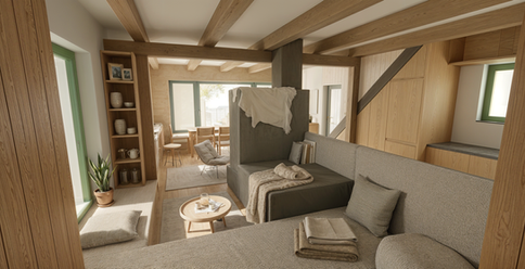 V patře je pak koupelna a malé ložnice, které se dají rozdělit nebo spojit podle situace.